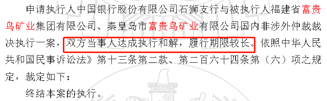 尽管富贵鸟股份破产时,富贵鸟矿业也官司缠身,存在多个被执行的案件,但从近两年的一系列裁判文书显示,富贵鸟矿业已与多个债权人达成了和解协议。