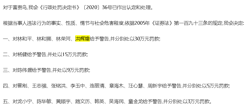 而在证监会2021年9月7日发布的对涉富贵鸟事件的21人处罚名单中,洪辉煌作为富贵鸟债券多份年报信披违法、债券发行时存虚假记载和重大遗漏的直接主管人员之一,与林和平、林和狮、林荣河一起被证监会给予警告,并分别处以30万罚款。