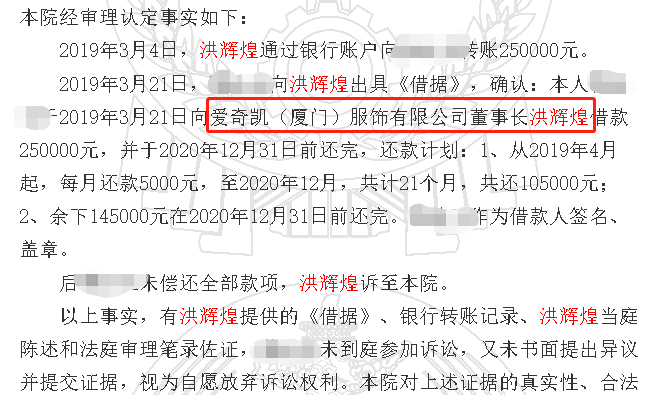 其次,2018年8月,太田商贸发生人员变更,执行董事兼总经理变更为洪某加。天眼查显示,洪某加当前为爱奇凯服饰有限公司股东和法人代表。而据几份司法文书显示,爱奇凯公司2019年3月时的董事长,又是洪辉煌,爱奇凯公司的原股东张某,是洪辉煌的亲属,爱奇凯本身应属洪辉煌的关联方公司,因此,太田商贸背后的洪某加与洪辉煌,在爱奇凯公司层面发生了联系。