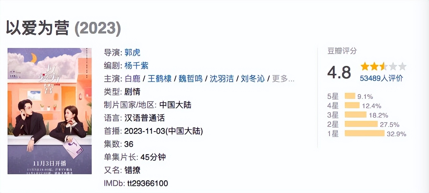 《以爱为营》虽连续十多日拿下了猫眼电视剧热度榜日冠、累计播放量破13亿,但更被市场所热议的是它豆瓣4.8的开分,以及被吐槽的诈骗路透、死亡运镜和土味妆造。