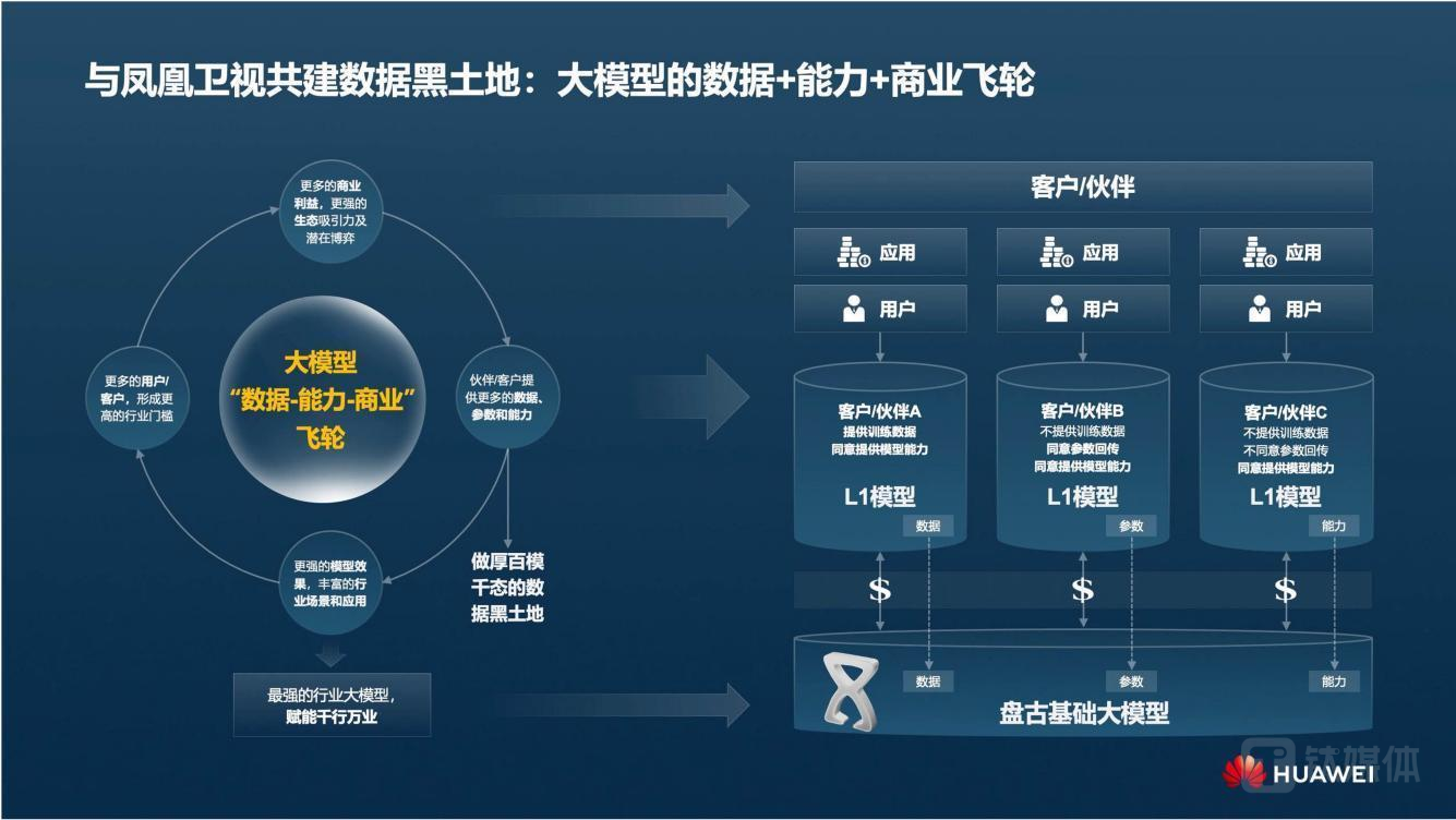 华为云EI产品部部长尤鹏带来《盘古大模型的数据之道》的主旨演讲。尤鹏表示,华为希望和凤凰卫视一起共建数据黑土地,共同探索产业界自下而上的数据合作路径和商业模式,共同构建大模型的“数据-算力-商业”飞轮,推动数据产业发展。