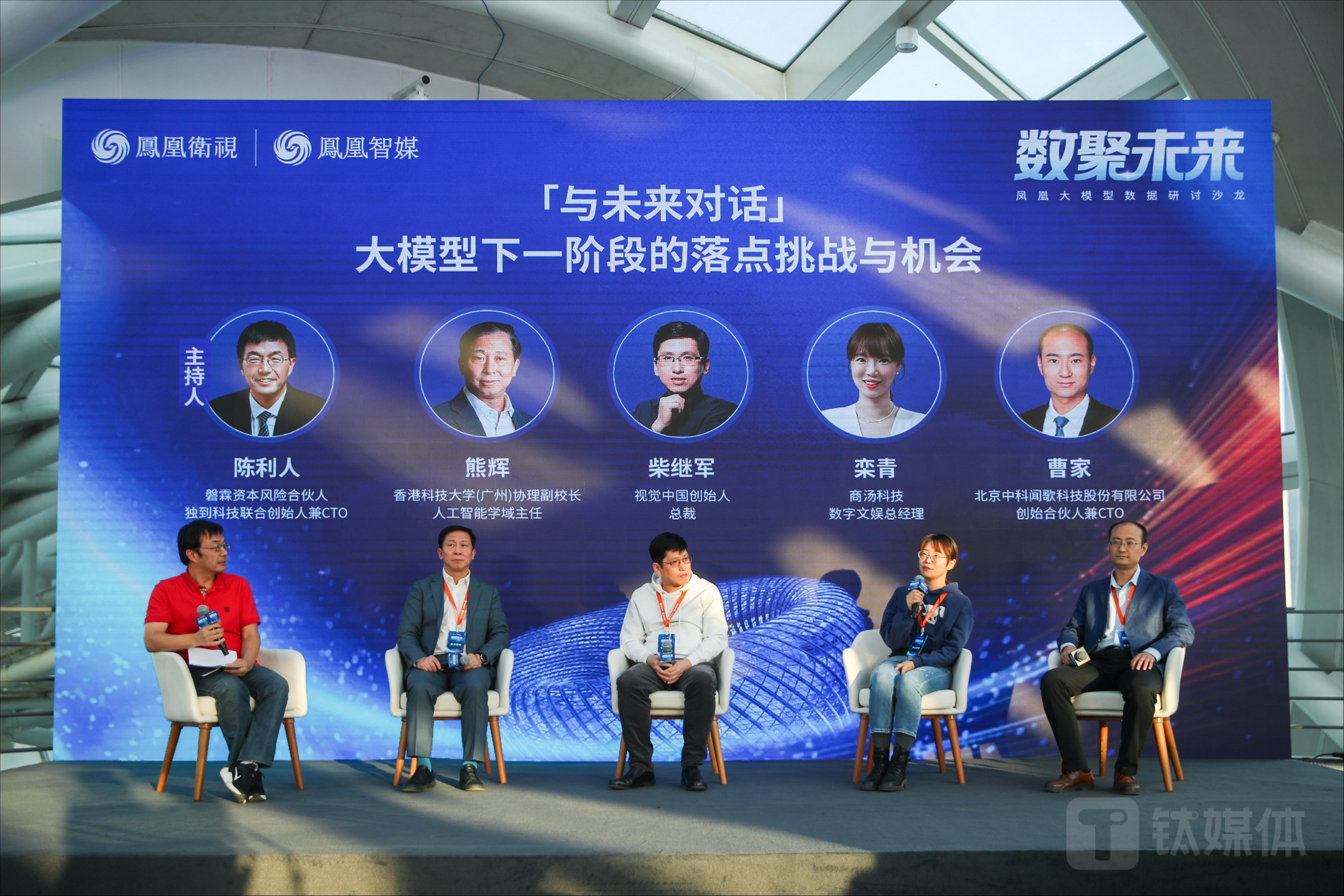 除主旨演讲外,香港科技大学 (广州) 协理副校长熊辉,视觉中国创始人、总裁柴继军,商汤科技数字文娱总经理栾青,中科闻歌创始合伙人兼 CTO 曹家参加了《“与未来对话” 大模型下一阶段的落点挑战与机会》圆桌论坛,各位来宾就自身领域发表了精彩见解,磐霖资本风险合伙人、独到科技联合创始⼈兼CTO陈利人担任主持人。