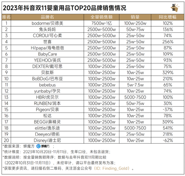 抖音双11婴童用品TOP20品牌销售情况