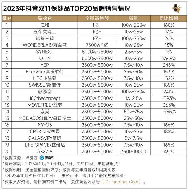 抖音双11保健品TOP20品牌销售情况