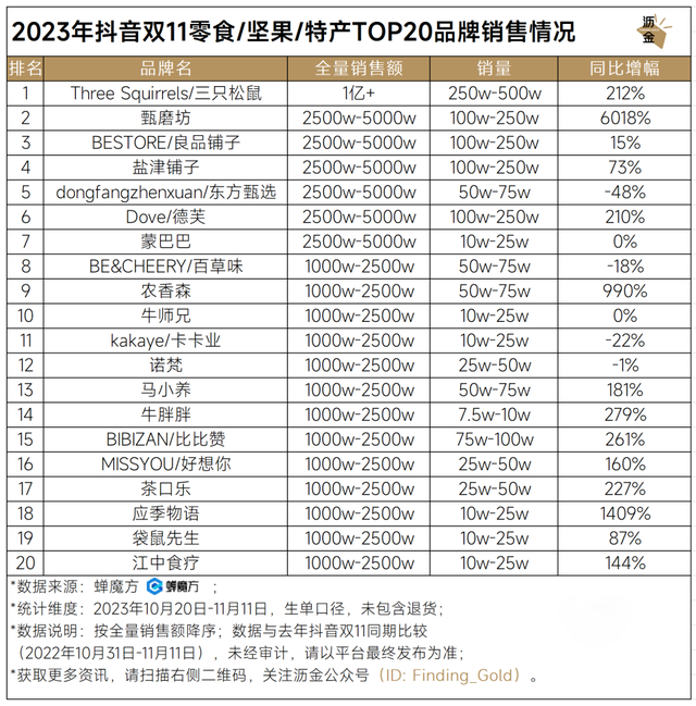 抖音双11零食/坚果/特产TOP20品牌销售情况