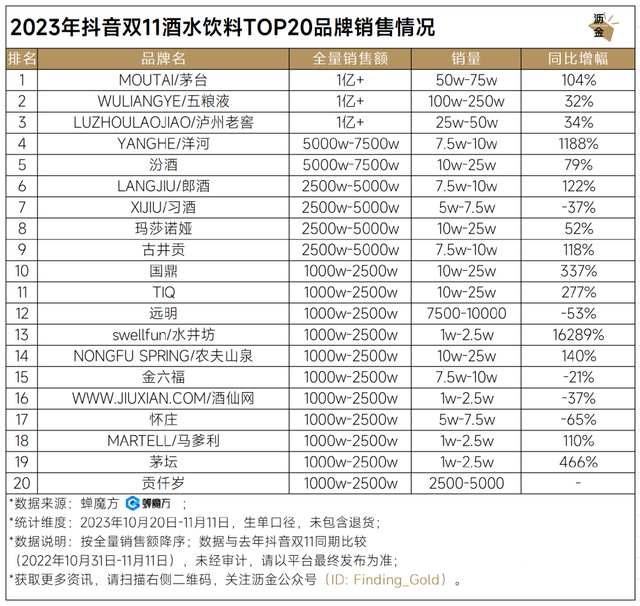 抖音双11酒水饮料TOP20品牌销售情况