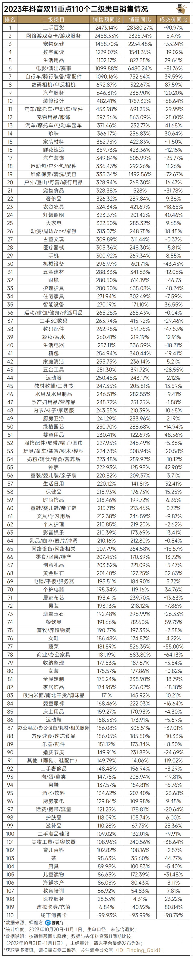 沥金联合蝉魔方对抖音双11的战绩(10月20日至11月11日)进行了抓取分析,以下为重点的110个二级类目的销售情况,18个重点类目的各类目TOP20品牌榜单及分析: