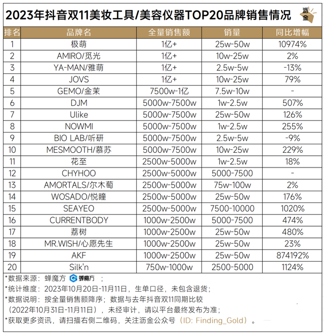 抖音双11美妆工具/美容仪器TOP20品牌销售情况