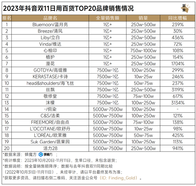 值得注意的是,本次只选择了抖音具有代表性的18个重点类目品牌榜单进行分析,且品牌表现和排名取决于品牌应对大促的策略,对于抖音双11战绩仅有部分参考作用。