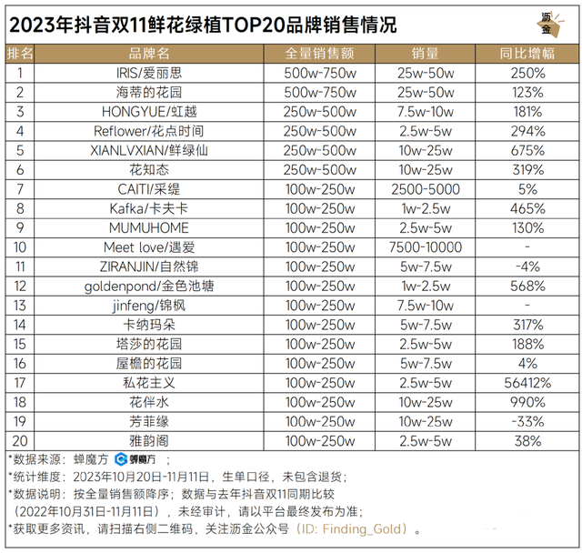 抖音双11鲜花绿植TOP20品牌销售情况