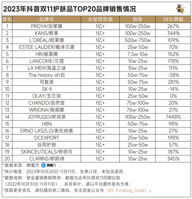 抖音双11护肤品TOP20品牌销售情况