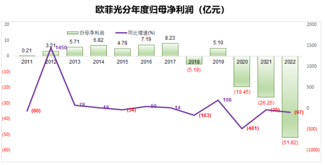 第一个被踢出局的是欧菲光。2020年被踢出苹果链之后,欧菲光连续三年巨亏,2022年亏损更是高达52亿,而历史上欧菲光年度最高的净利润也只有不到9个亿。