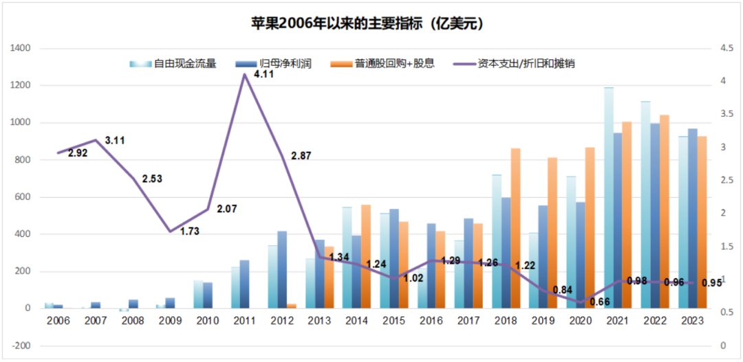 与此相对照的是,2011年苹果的资本开支绝对值上并不低,共有75亿美元,后续也基本上维持这样的水准,但资本开支与折旧摊销的比值却逐年下降,最近三年这个水平还不到1,这表明苹果现有的资本开支还不够维持正常的简单再生产的水平。