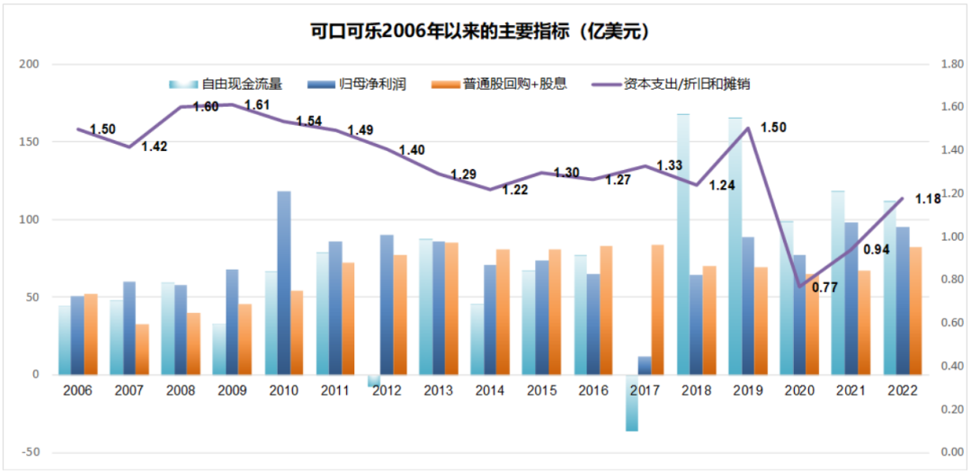 这种情况是不是离谱我们要看对比。可口可乐同样也是巴菲特的爱股,大消费的典型。可口可乐大部分的净利润以及相关的自由现金流也用来回报股东,但是大部分年份,可口可乐资本开支与折旧摊销的比值还要大于1。