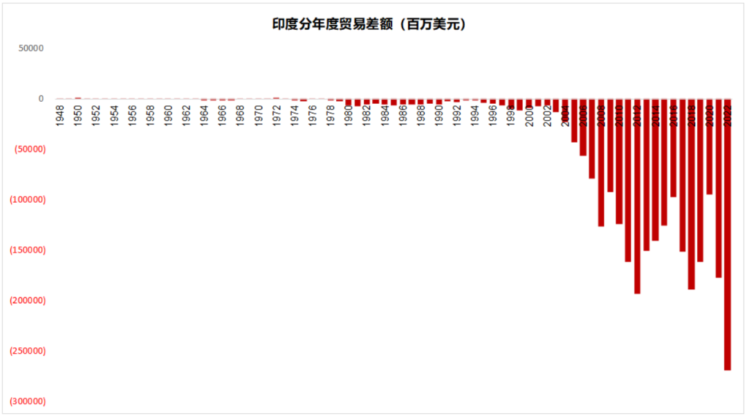 上面这张图,是印度1948年以来,每年的贸易差额。你会发现,印度独立以来75年,只有2年是顺差,而且从2003年开始,印度的贸易逆差逐年扩大,2022年印度的年度年度贸易逆差创了历史新高,2689亿美元,75年的累计贸易逆差2.62万亿美元。