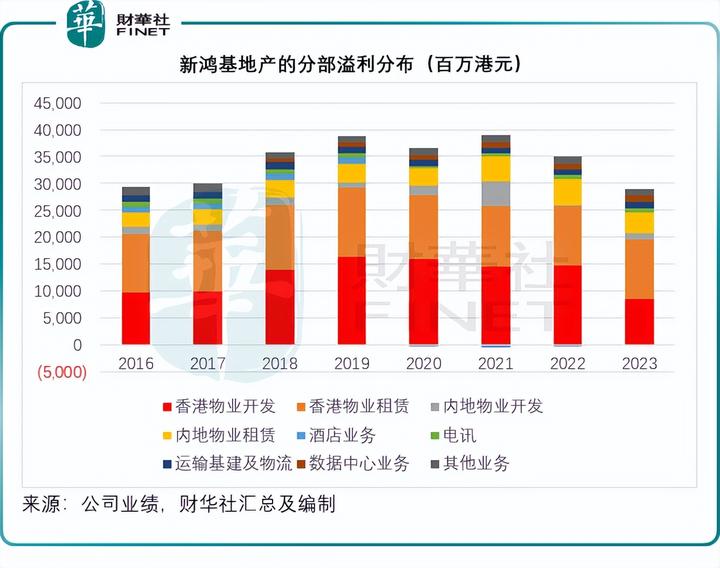其中,香港物业开发与租赁业务是新地主要的收入来源,见下图的收入分布表,香港物业开发(红色部分)与香港物业租赁(橙色部分)始终占据每年收入贡献的一半以上。