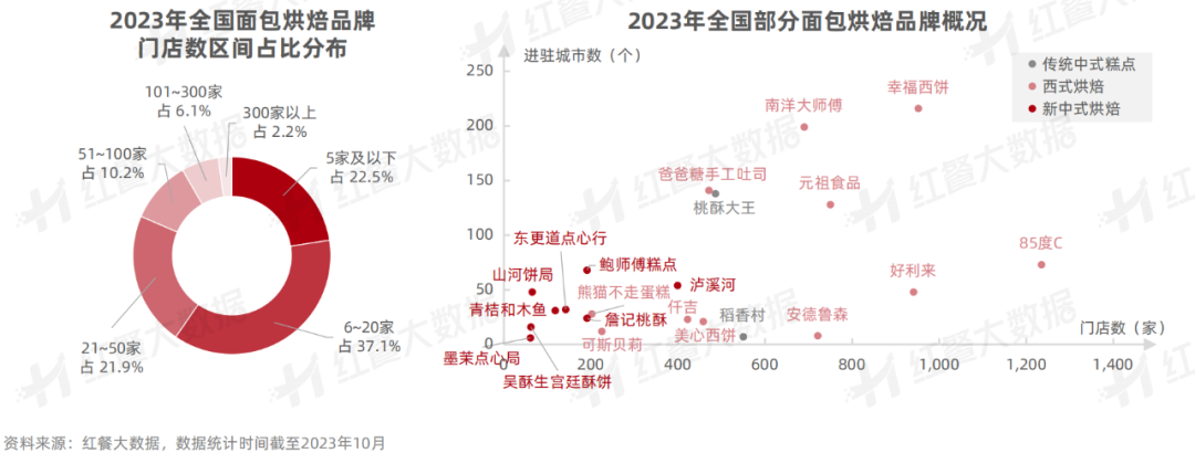 从细分品类上看,新中式烘焙品牌在门店数量上与西式烘焙品牌存在较大差异。具体来看,门店数在500家以上的品牌主要集中在西式烘焙赛道,这得益于其多年的发展积累。相比之下,新中式烘焙品牌的门店数普遍在100家以下。实际上,与西式烘焙相比,新中式烘焙的发展历史相对较短。因此,起步较晚的新中式烘焙目前整体连锁化程度相对较低。
