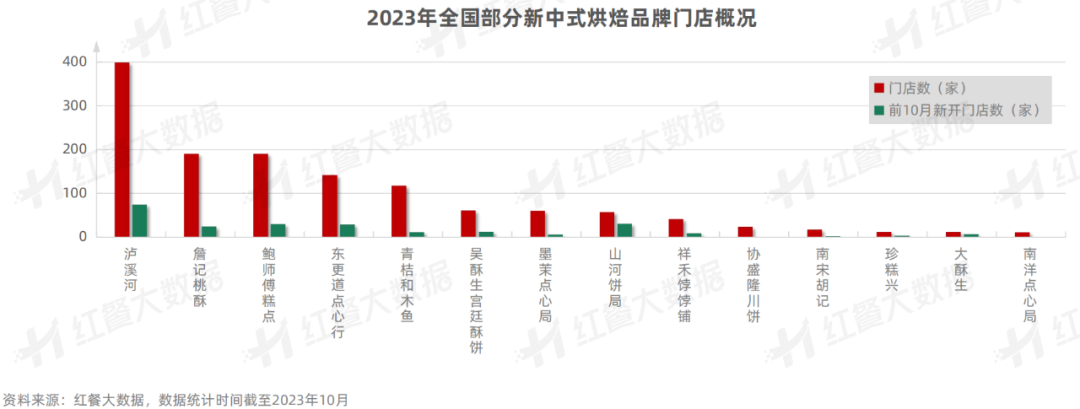 从新中式烘焙品牌的发展情况来看,泸溪河在门店数和拓店速度上领先于其他新中式烘焙品牌。詹记桃酥、鲍师傅糕点和东更道点心行也拥有相当数量的门店,在市场中同样具有一定的竞争力。另外,值得注意的是,山河饼局近期门店扩张速度相对较快。