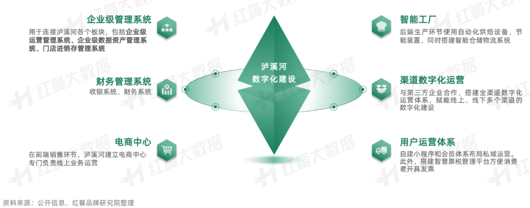 数字化建设是当下所有餐饮品牌都较重视的板块,泸溪河也很早就做了数字化体系的建设。整体上看,泸溪河的数字化建设基本覆盖了前端销售运营和后端工厂生产,如渠道数字化运营体系、电商中心、用户运营体系以及智能工厂等。