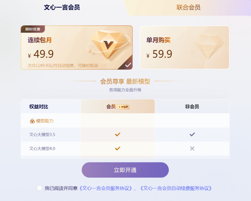 又过了一个多月。11月初,我们听到了百度文心一言对C端用户推出“专业版”的消息。而且还不便宜:定价为59.9元/月,连续包月优惠价49.9元/月,再有就是跟文心一格捆绑的套餐。