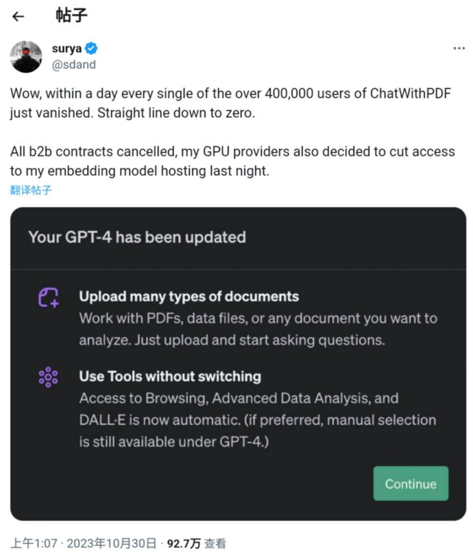 例如,大多数初期上线的ChatGPT插件都是提供PDF文档、网页读取的功能,它们基本被“团灭”。ChatwithPDF插件作者说,一夜之间,他的插件商业使用订单和访问都下降到0。