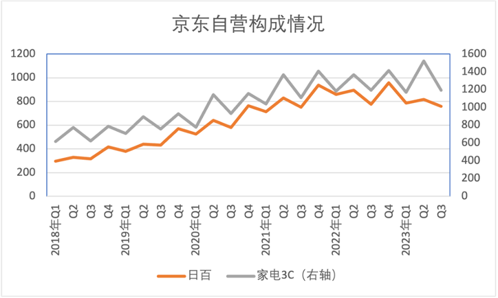 其二,2018年以来,非3C化品类异军突起(尤其在京东超市的成功运营之下),成为彼时京东降3C权重,实现全品类运营最好的注脚,只是在当前似乎又有了一些不确定性。