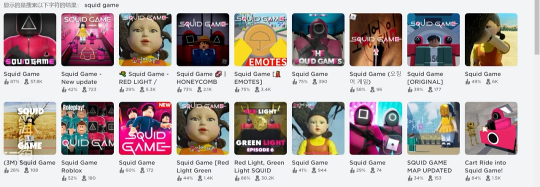 “快”,是吸引Z世代乃至α世代年轻人最有效的方式。例如在剧集《鱿鱼游戏》爆红的时间点,Roblox上就出现了大量相关的小游戏,经过了短时间的“笼斗”之后,玩家们就会集中在感兴趣的几个产品内。与此同时,游戏视频博主为了能够蹭到鱿鱼游戏的热度,制作Roblox中鱿鱼游戏的闯关视频,加速Roblox在游戏域外的传播。