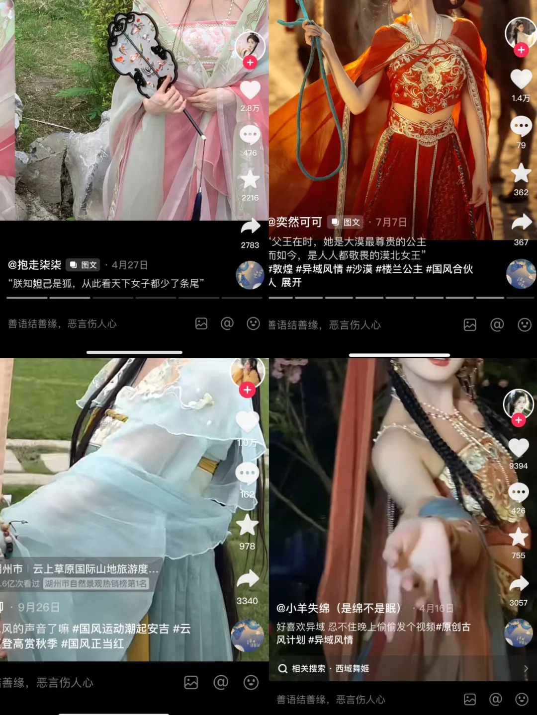 以汉服类视频为例。Z世代年轻人民族认同感的觉醒,刺激了国潮经济的发展,汉服作为民族认同感的一部分而成为了抖音视频生态的重要分支,汉服类视频的最佳配乐就是国风歌曲。