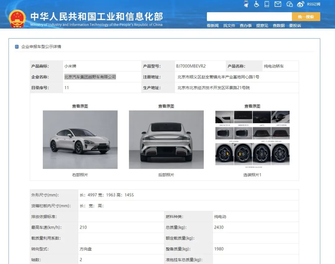 该公示文件信息显示,小米汽车的产品商标为“小米牌”,企业名称为“北京汽车集团越野车有限公司”,产品名称为“纯电动汽车”,注册地址为北京市顺义区赵全营镇兆丰产业基地同心路1号,生产地址为北京经济技术开发区环景路21号院。