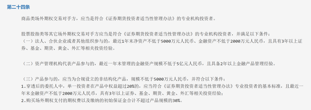 一方面出于衍生品市场的参与限制问题,不少私募基金都被准入要求拒之门外。尤其是受到私募追捧的场外期权,根据《证券公司场外期权业务管理办法》,其对于年限以及资金规模都有着较高的要求,以至于许多新成立的小型私募根本无法参与其中。