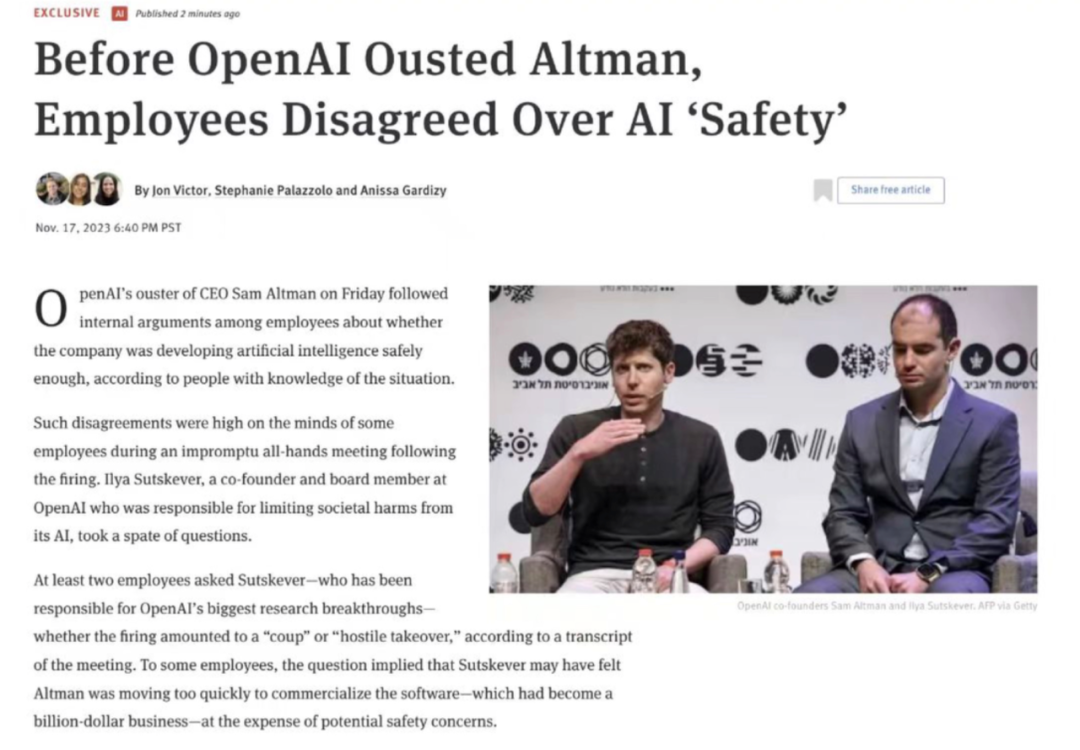 第三种说法有点耸人听闻却也是最有可能的情况,据公开信息显示,在 OpenAI 驱逐 Altman 之前,员工对人工智能安全存在分歧。这与OpenAI成立之初的技术理念有关,即构建良好的人工智能,并在坏人构建坏种类之前占据主导地位。