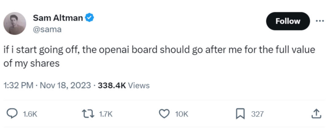 故事的剧情仍在以秒为单位推进。消息发出后,OpenAI拒绝了所有的回复,而Altman在两个小时后首次发声:如果我向公司“开火”,OpenAI董事会将向我索赔。