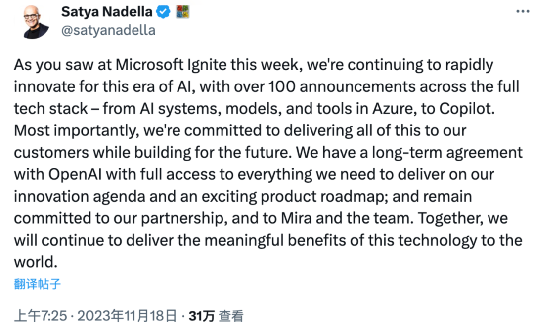 在OpenAI发布公告后的两个小时里,微软CEO 纳德拉便发了帖子,简单总结一下:微软和OpenAI的合作会一如往常,也将支持新任CEO Mira的工作。