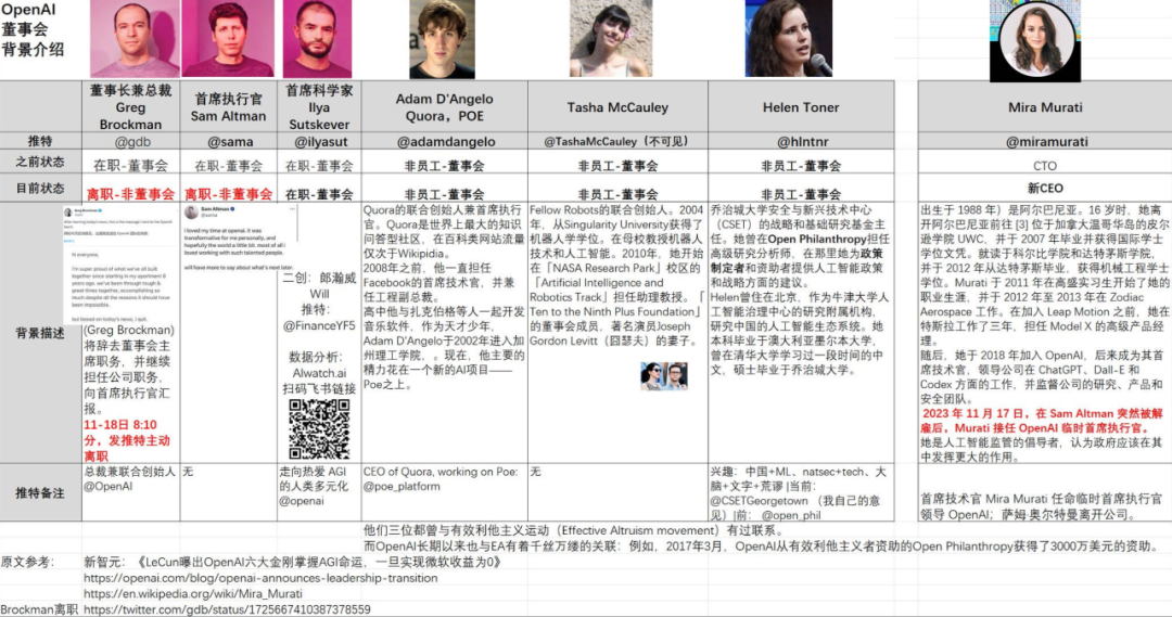 让我们简单复盘一下此前OpenAI董事会的架构,Greg、Altman、Sutskever是OpenAI的三个灵魂人物,Altman找到了Greg,Greg介绍了Sutskever,董事会的其余人员包括演员的老婆、竞争对手和一个政客。注意,新上任的CEO Mira Murati此前并不是董事会的成员。