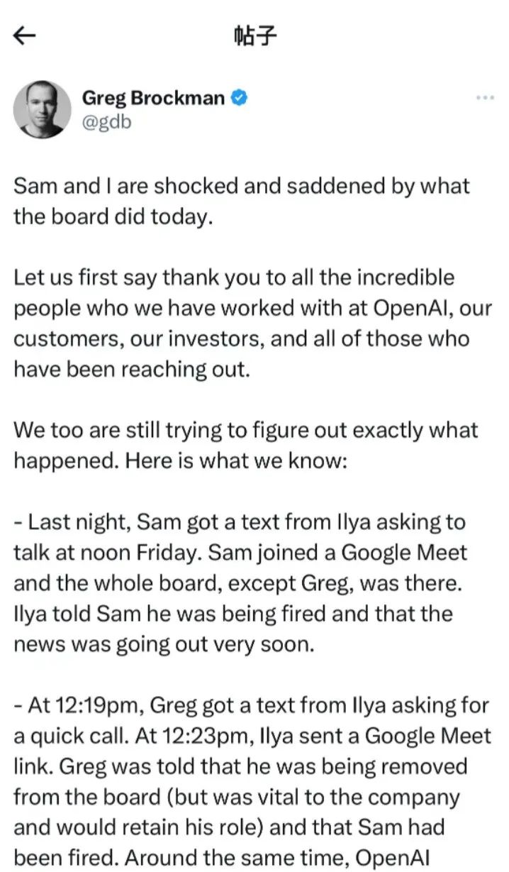 11月17日中午12:23。Greg在董事会中被告知,他将被董事会除名,但保留其职务,且Altman已经被解雇;