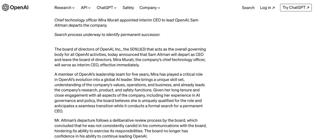美东时间11月17日下午,OpenAI官网突发了有一篇关于新的人事任命消息。简单翻译一下这篇文章“Sam Altman不诚实,我们把他辞了,新CEO也挺牛逼,我们还会继续做下去。”