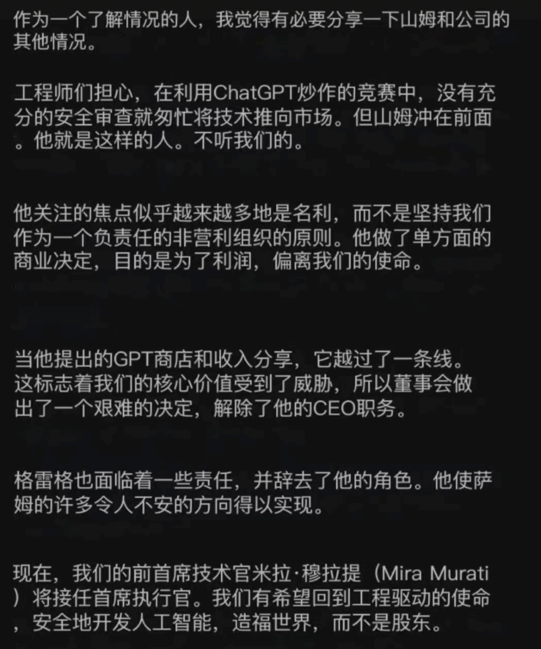 大约在同一时间,OpenAI官网发布了一篇人士变动的通知。而除了新CEO Mira是在前一天晚上知道的以外,其他董事会成员应该很早就知道了此事。