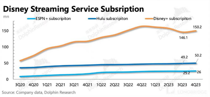 此前,迪士尼业务大类分为传媒及娱乐分发、迪士尼公园体验及产品两大块,而传媒及娱乐分发下再分成有线媒体、DTC(包括Disney+、Hulu以及ESPN)、影视内容销售以及公园与商品消费。本季度,迪士尼取消了传媒及娱乐分发部门,将整体业务重新分配成娱乐(Disney+、Hulu)、体育(ESPN频道)以及体验三大部门。每个业务部门的领导将对创意开发、市场营销、技术、销售和分销负有全面的运营控制和财务责任,并负责推动全球业务效率。