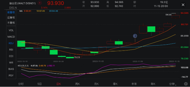 美东时间11月9日盘后,迪士尼发布了2023财年第四季度(自然年2023年第三季度)财报。本季度,迪士尼实现营收212.41亿美元同比增长5.41%,净利润为2.64亿美元同比增长62.96%。虽然营收不及预期,但仍不影响迪士尼股价大涨,从财报发布前一天84.5美元/股截止11月15日收盘的93.93美元/股,涨幅已经超过11%。