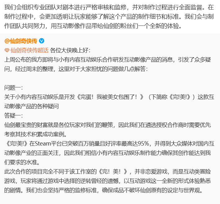 或许与当下连篇累牍关于《完蛋》的报道,放大了其中一些与肢体互动及女演员颜值身材方面的内容有关,很多玩家在没有详细资料的情况下,很容易以《完蛋》作为参照物去构想《仙剑》真人游戏的呈现方式,比如一款顶着《仙剑》角色名字的“仙侠版《完蛋》”。