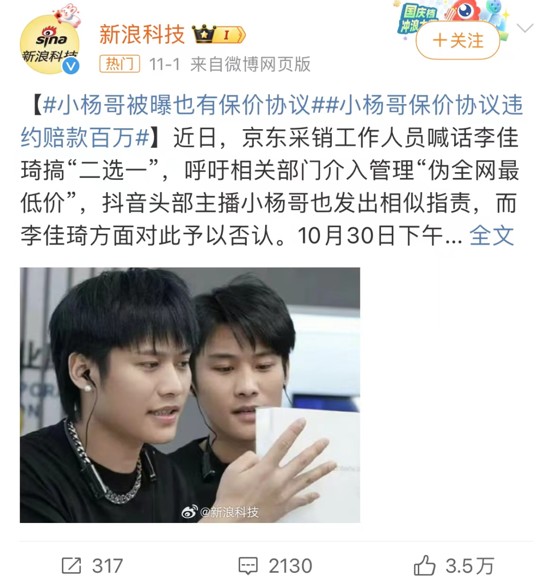 因此,“小杨哥被曝也有保价协议”的话题迅速冲上热搜。大部分看客都认为头部主播有“保价协议”。