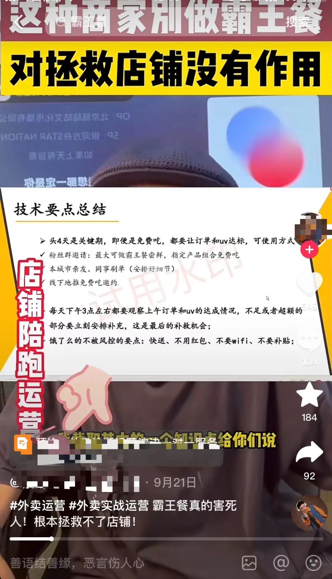 但随着外卖平台的营销竞争越来越激烈,霸王餐成为一种难以抗拒的"诱惑":一间新店会被品牌方要求登陆霸王餐平台来做营销;新上架外卖平台的商家也会接到霸王餐运营方打来的推销电话;打开自媒体视频,劝说商家使用霸王餐的运营账号也比比皆是。