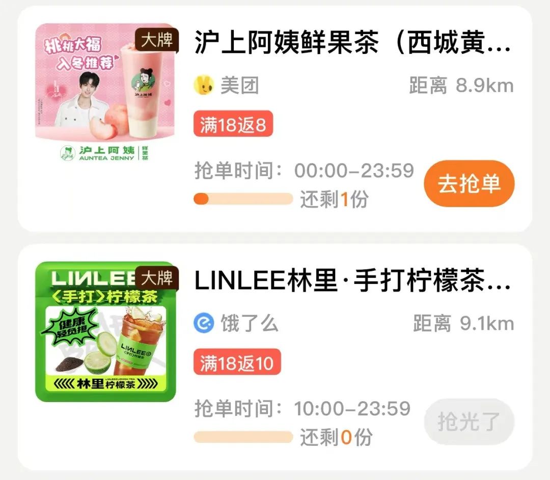打开一家霸王餐平台,除常见的麻辣烫、盖浇饭、轻食类的快餐店,还有一些餐饮品牌如袁记云饺、窑鸡王、曼玲粥店的加盟店。除餐饮类,一些知名奶茶店如奈雪、茶百道、沪上阿姨、瑞幸也在其列。