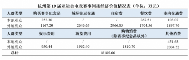 前几天由由浙江大学国家体育产业研究基地、华中师范大学国家体育产业研究基地联合发布的《亚运电竞赛事赋能城市发展评估报告》显示,杭州亚运会电竞带来的商业价值约为2.6亿元,其中包括门票、特许商品在内的直接经济价值7877.53万元。而间接经济价值1.82亿元,因为电竞,5.8万人来到杭州“吃住行游购娱”。