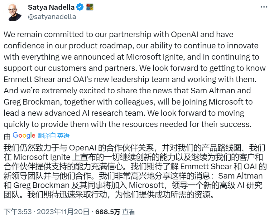 输掉的 Altman 决定加入微软——后者是 OpenAI 最重要的投资人(注资 100 亿美元)、最重要的算力资源提供方,也是 Altman 的坚定支持者。微软董事长兼首席执行官萨蒂亚·纳德拉在推特上宣布了这一消息。