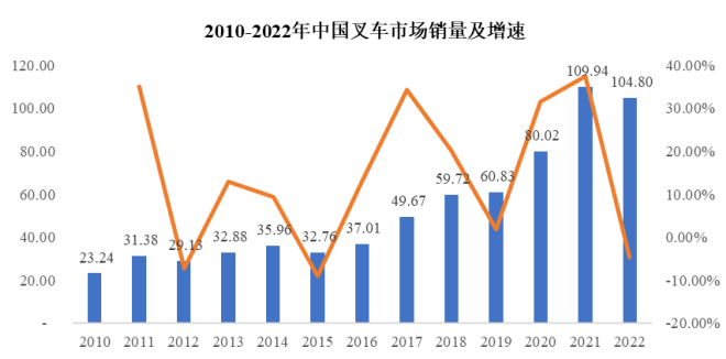 中国工程机械工业协会披露的数据显示,2022年国内叉车销量为104.80万台,同比下降4.68%。