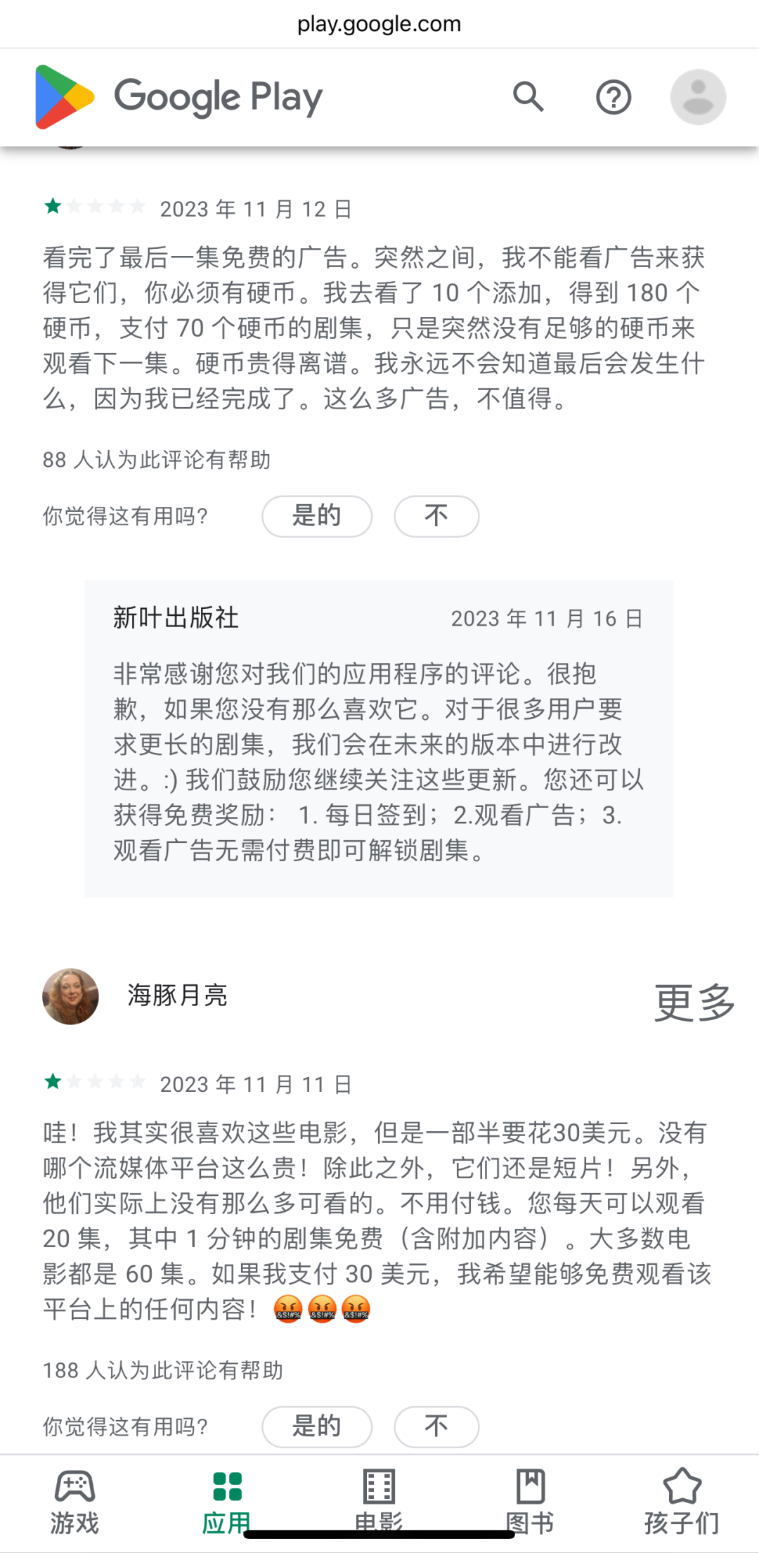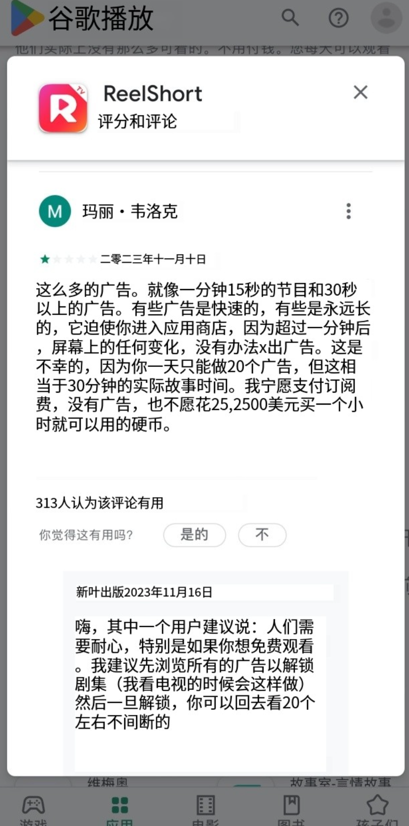 而在Google Play上,ReelShort 下载页面的评论区,也都是对于付费的吐槽。