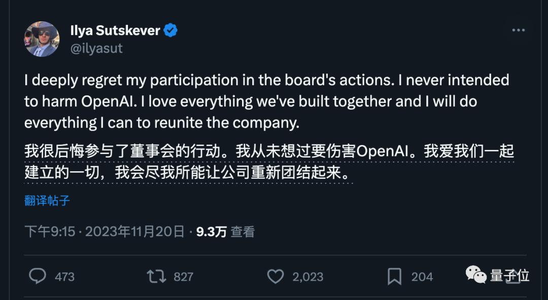 Ilya还发表了推文,“我很后悔。我从没想过 要伤害OpenAI。我将尽我所能让公司重新团结起来。”