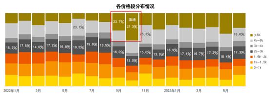 2、新周期手机均价较现阶段小幅抬升,2000-3000-4000元各个价格带分布均衡。