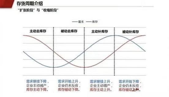 1)衰退:需求下降+主动去库存;2)复苏:需求上升+被动去库存;3)过热:需求上升+主动补库存;4)滞胀:需求下降+被动补库存,每个阶段持续3个季度左右,需求和库存分别分为约7个季度上升期,7个季度下降期。